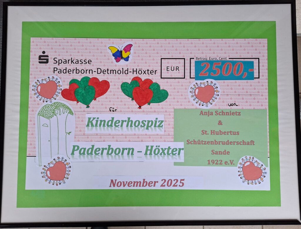 Durch die großartige Unterstützung vieler Freundinnen, Freunde und Gäste kam bereits eine beachtliche Summe zusammen. Beim Hubertussonntag am 09.11.2025 wurde diese durch die großzügigen Spenden der Schützen noch einmal deutlich aufgestockt – sodass nun insgesamt 2.500 € für das Hospiz übergeben werden können.